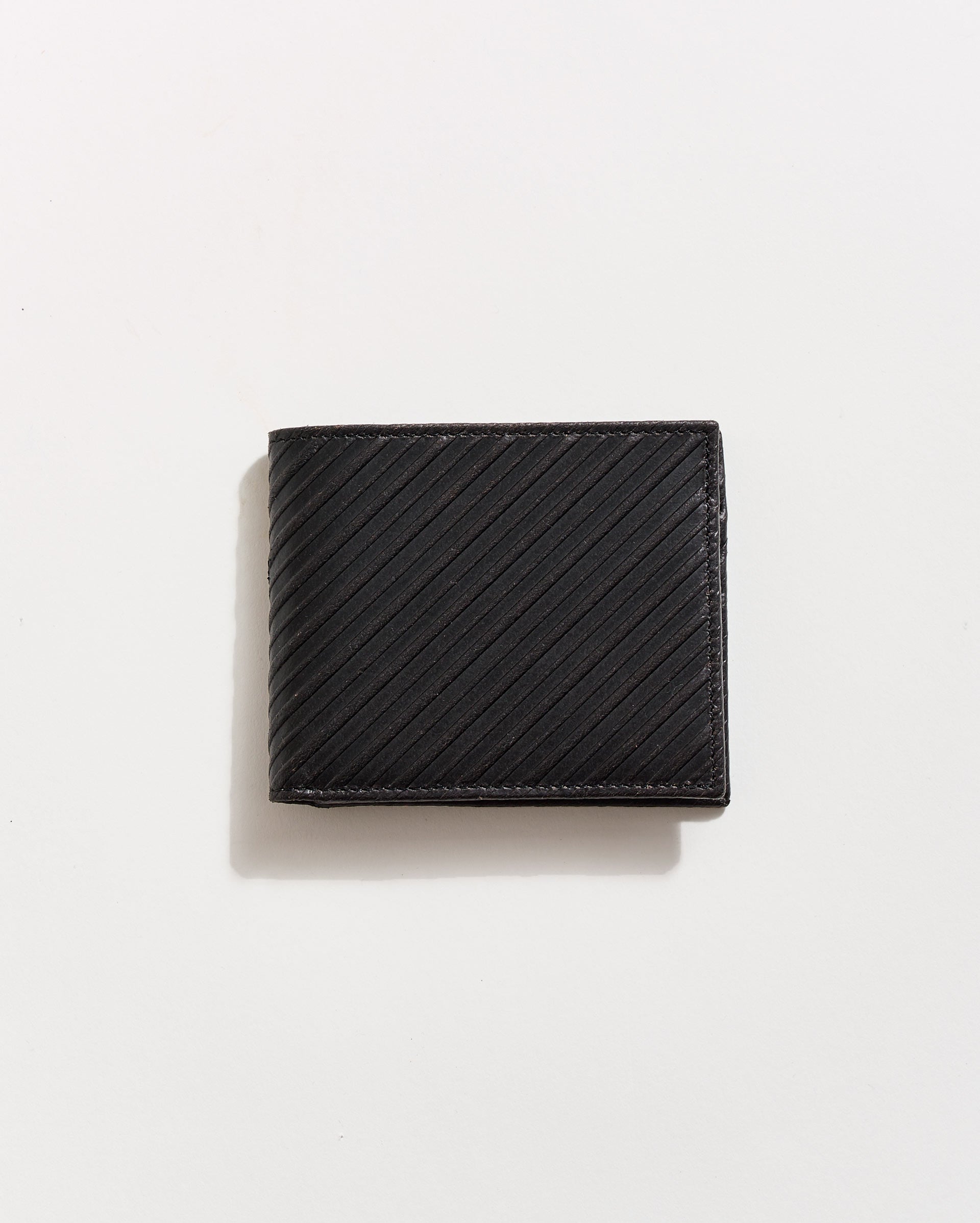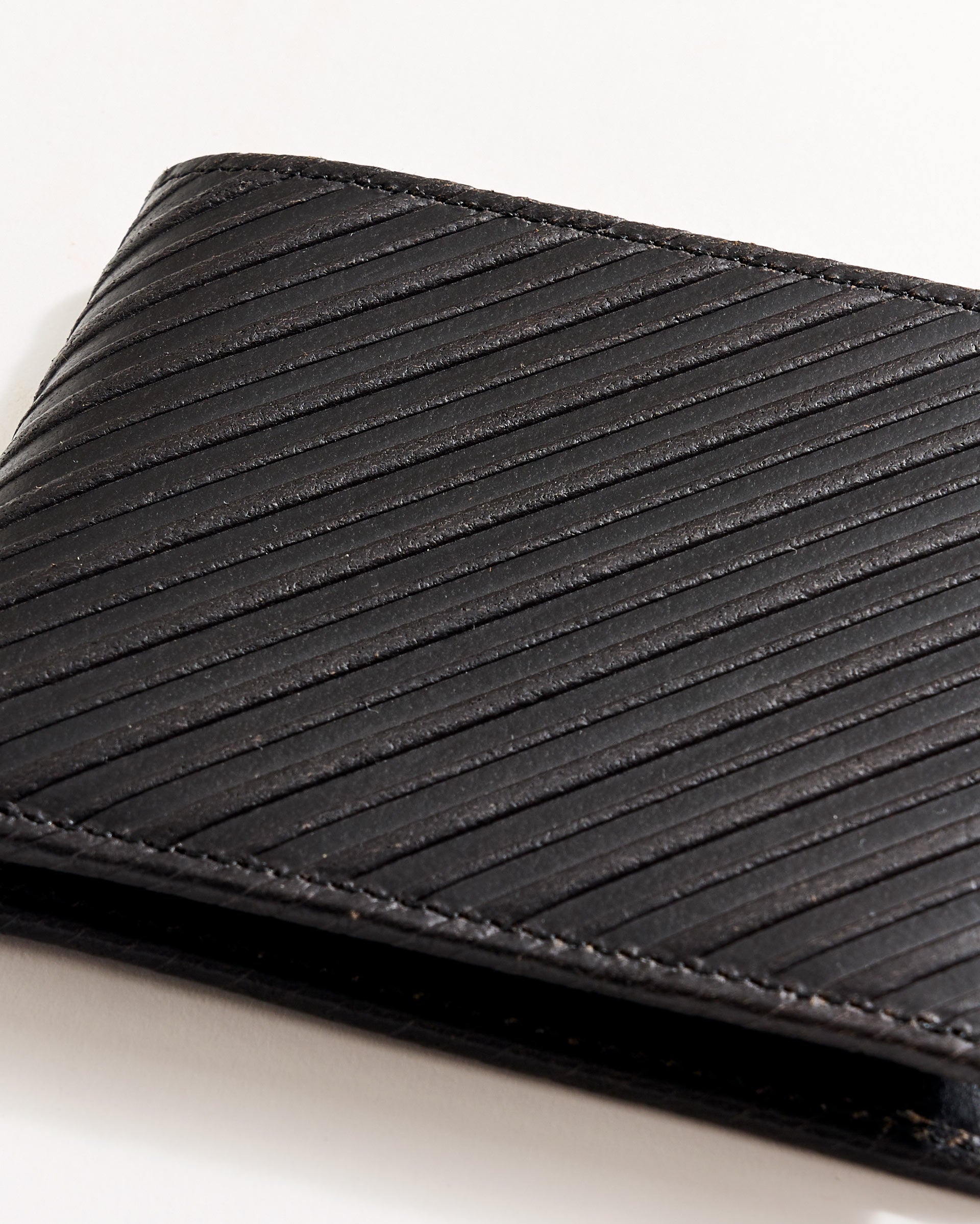 We took the classic bifold wallet and reimagined it with functional sleeves. This wallet features rich leather, embossed with our signature heirloom ribbon stripe.