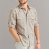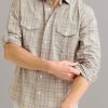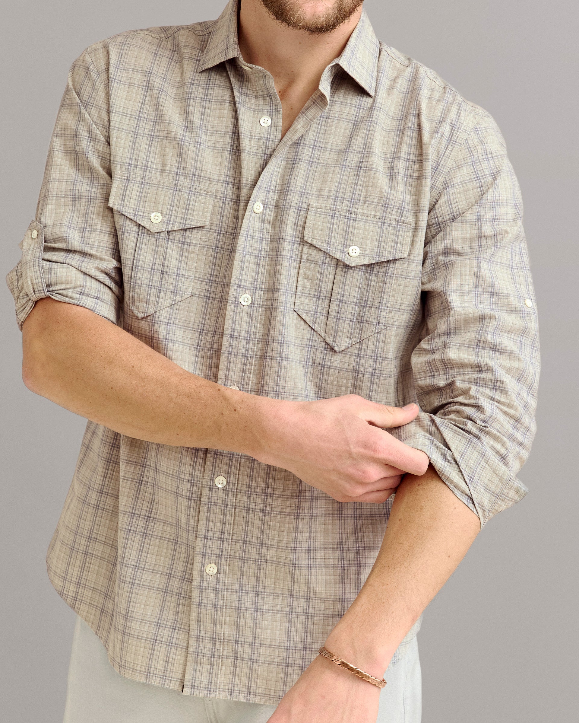 The Scout Shirt was built for comfort, with enough structure to look polished. It’s the first thing we’re reaching for when dressing for the weekend. It’s cut with a standard fit, and features a spread collar, two spade-shaped pockets with flaps, barrel cuffs and a roll sleeve that buttons shut. It’s topped off with mother of pearl buttons and our heirloom ribbon applied to the bottom of the under-placket. This version is cast in a highway grey colorway with melange yarns woven throughout in a pattern exclusive to Billy Reid.