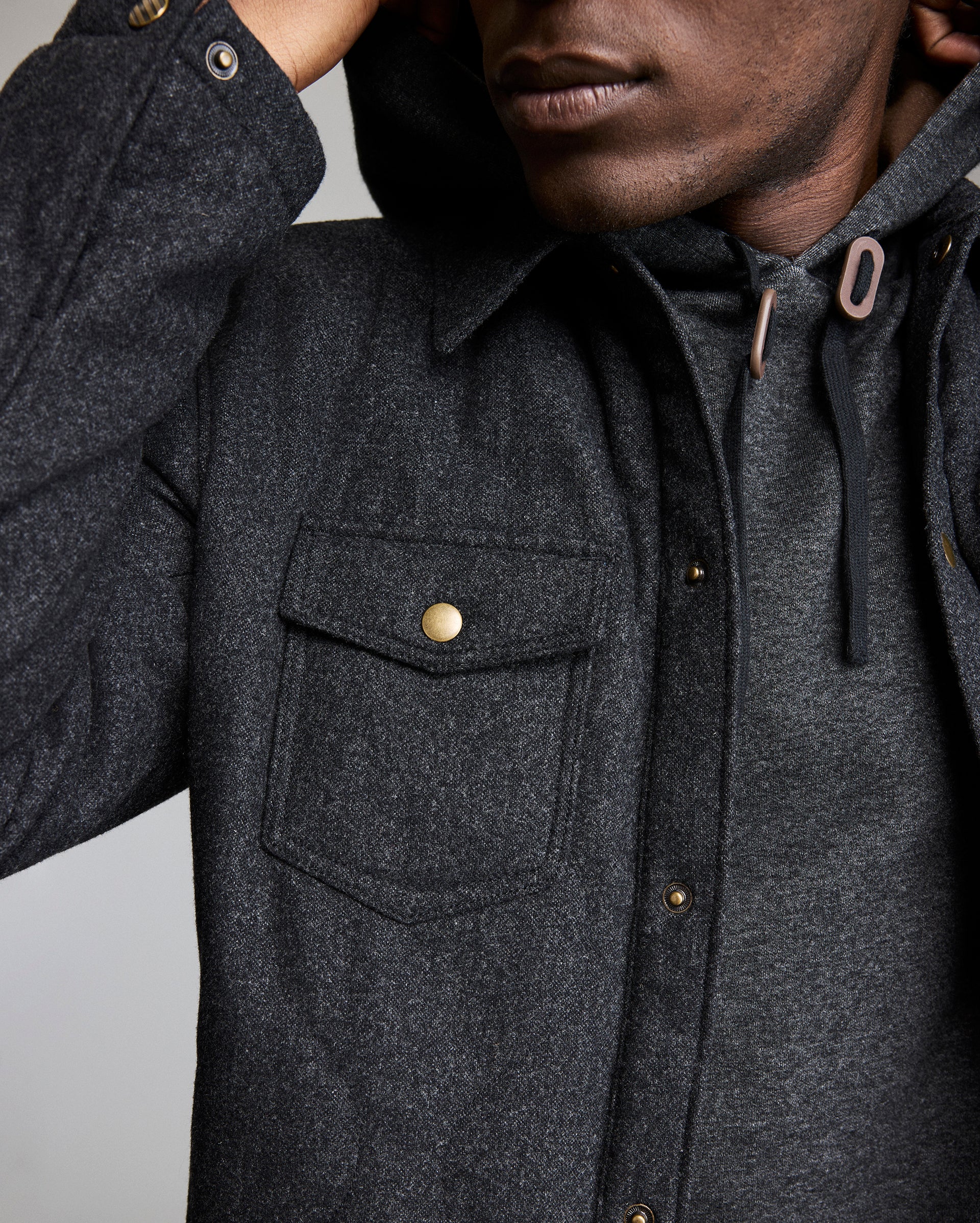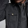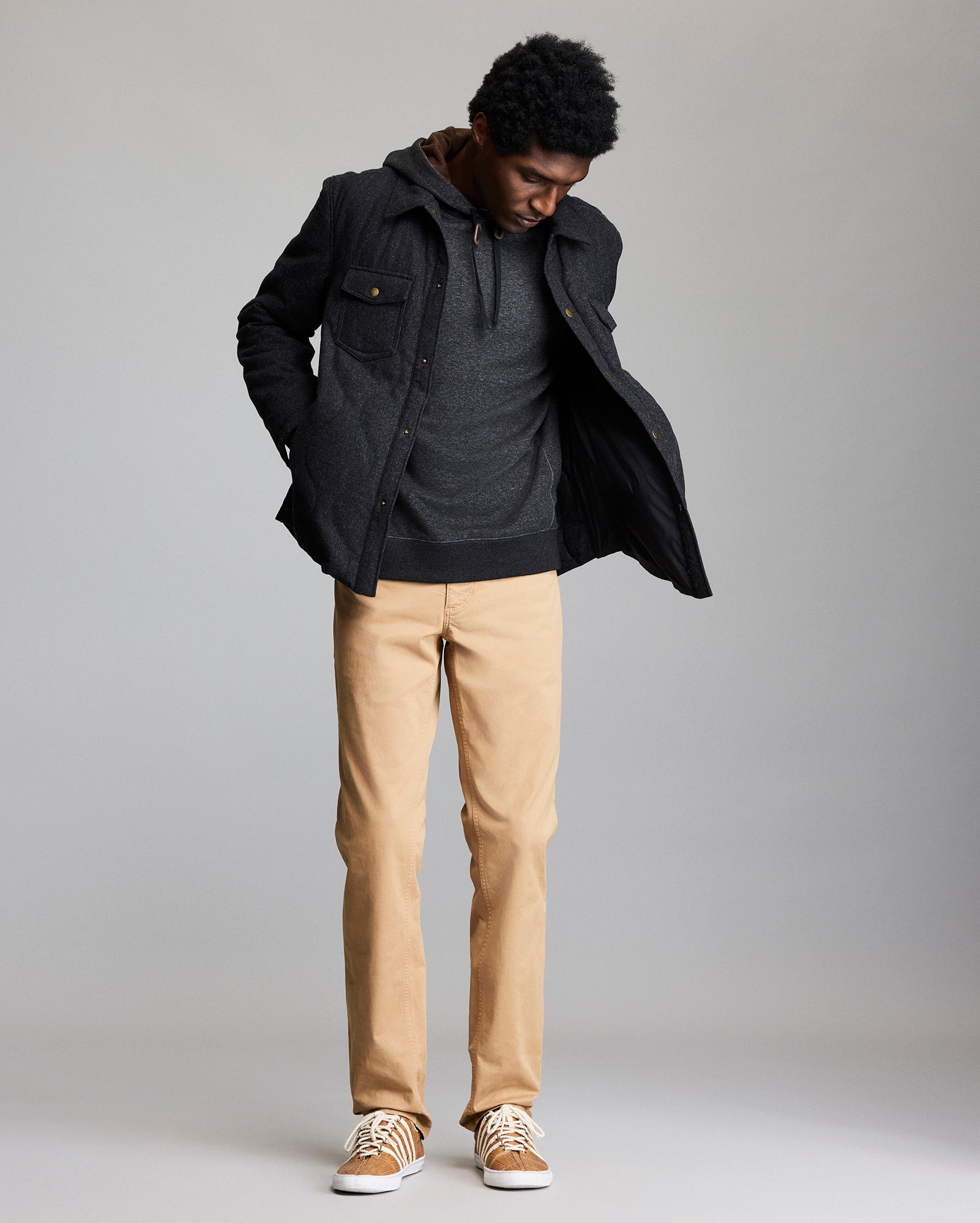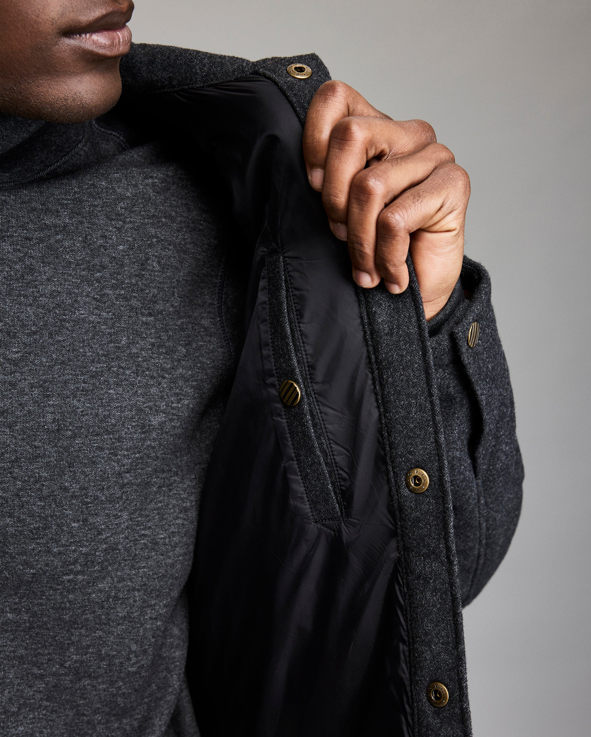 The Theo shirt jacket offers comfort and versatility in equal measure, thanks to its onion quilted body that has been insulated with comfortemp air fill, made with recycled polyester. Finished with heritage Billy Reid details like antique brass snaps at the chest and cuffs, a leather locker loop, and a subtle ribbon stripe branding at the back of the neck. Perfect for layering over a sweatshirt or sweater on chillier days, it works just as well over a polo or tee in late summer and early fall.