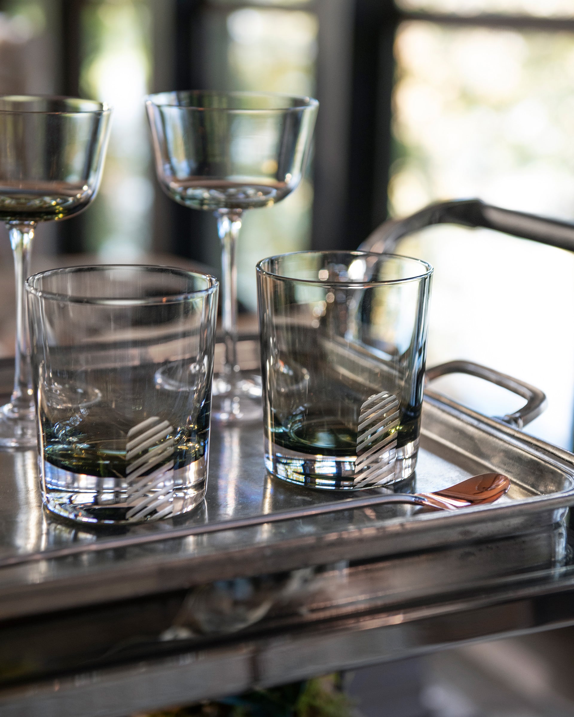 Upgrade your next cocktail hour with exclusive glassware and tools from our collab with Williams Sonoma. These sculptural coupe glasses are crafted from mouth-blown crystalline that has been fire polished and hand-etched with our signature heirloom stripe at the base. The unique color is inspired by Billy’s love for oysters. Set of four glasses.